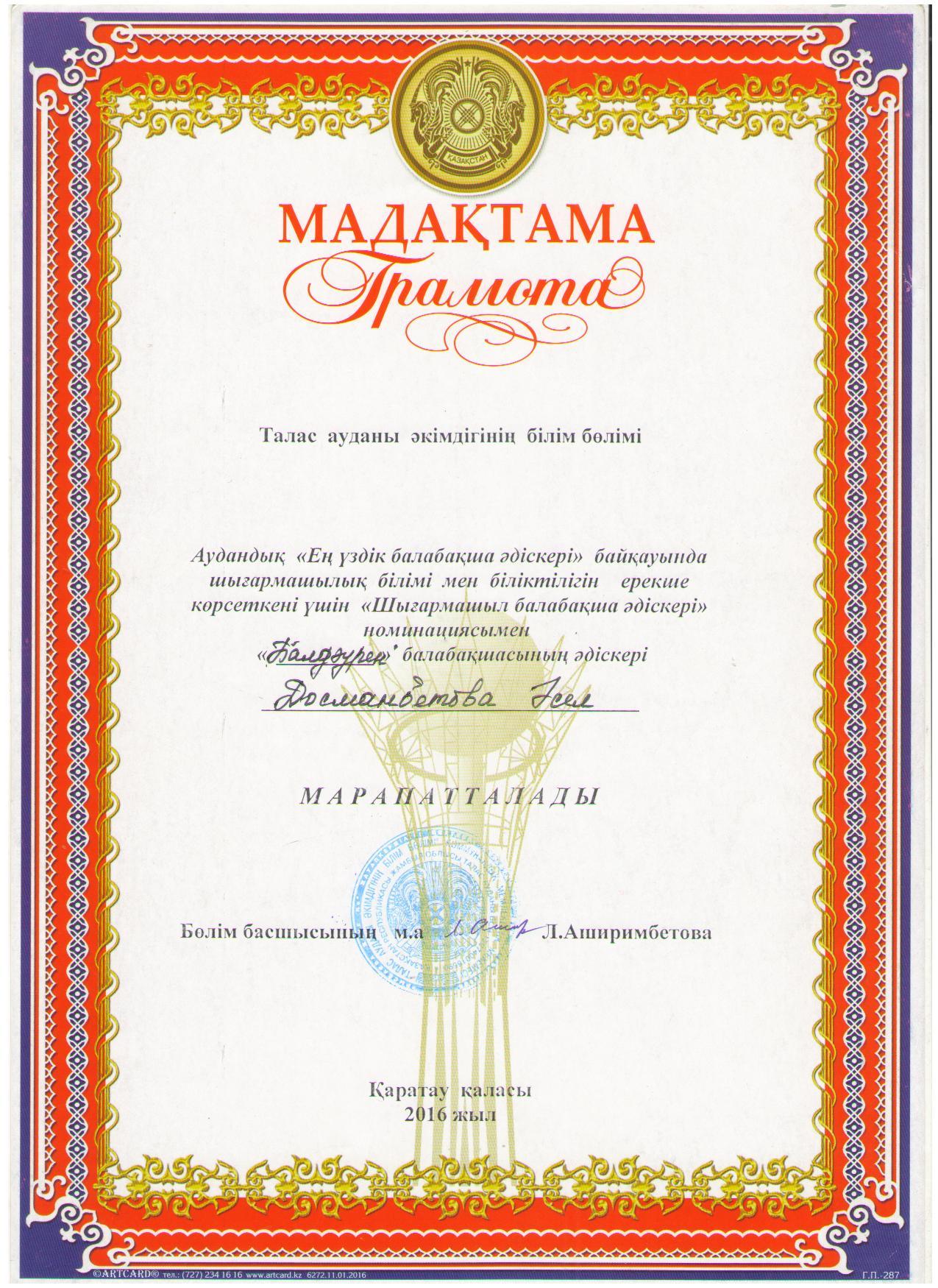 2016 жылы – Аудандық «Ең үздік балабақша әдіскері» атты байқауына қатысып, «Шығармашыл балабақша әдіскері» номинациясымен марапатталды.